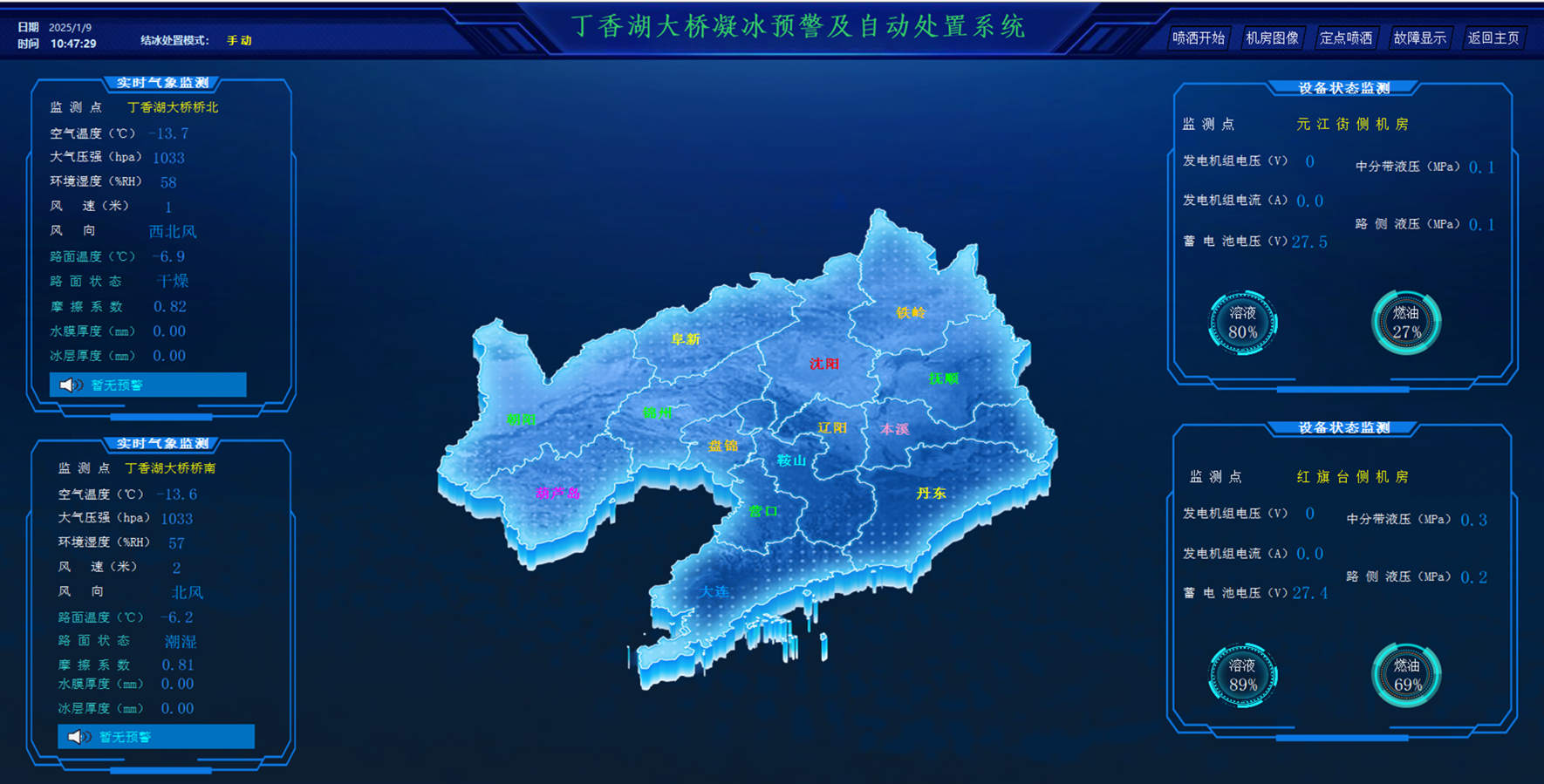 沈阳绕城高速后丁香大桥(下行,大连方向)布设的“桥面凝冰预警及自动化处置系统”已投入使用,能够捕捉不受路面介质影响的真实冰点,实行桥面凝冰的感知和预先处置,使桥面防凝冰效果取得实效,确保冬季桥面的行车安全,真正实现了从被动除冰到主动防冰的转变。